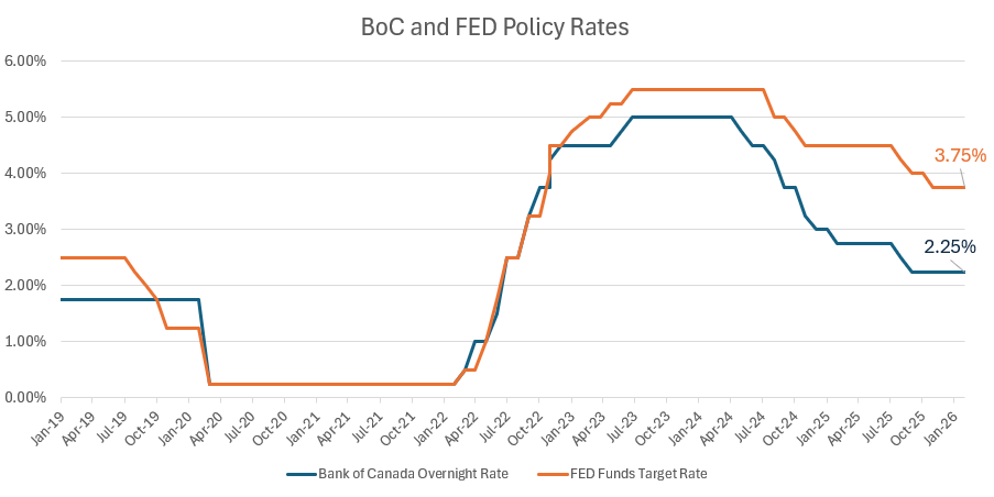 On March 18th, both the Bank of Canada and the U.S. Federal Reserve announced that they are holding their policy rates steady, a decision that comes during the times of heightened economic uncertainty and ongoing geopolitical tensions in the Middle East. The Bank of Canada maintained its overnight rate at 2.25%, a level unchanged since October 29, 2025, while the Federal Reserve kept its target range at 3.50%–3.75%, where it has stood since December 11, 2025. These decisions reflect a cautious stance by both central banks as they balance signs of slowing economic momentum with renewed inflation risks linked to recent energy market volatility and broader global instability.