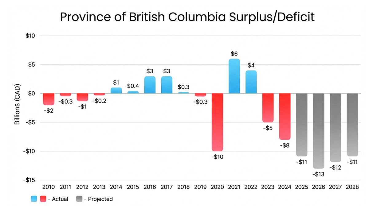 This trend becomes more apparent when looking at the trajectory of BC’s finances. As deficits persist, the province must continue issuing new debt to fund its operations, increasing its overall debt burden. At the same time, interest costs are rising as new borrowing is issued at higher rates than in previous years. This creates a compounding effect, where higher debt issuance leads to rising interest expenses, increasing the share of revenue allocated to debt servicing, which in turn contributes to larger deficits and necessitates further borrowing. Over time, this dynamic can become increasingly difficult to reverse, particularly if economic growth does not keep pace with the expansion in debt.