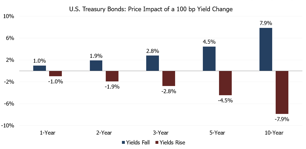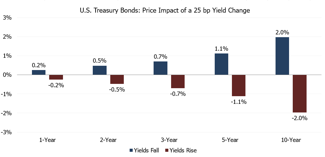 Not all bonds respond in the same way to changes in interest rates. One of the most important factors is maturity. Shorter-term bonds tend to experience relatively small price changes, while longer-term bonds are more sensitive, with price movements becoming more pronounced as maturity increases.