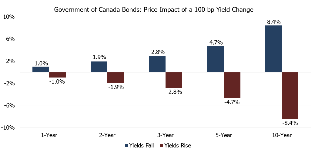 Source: Refinitiv. Illustrative price impact based on the modified duration of representative Government of Canada and U.S. Treasury bonds. Actual price changes may vary depending on bond characteristics and market conditions.